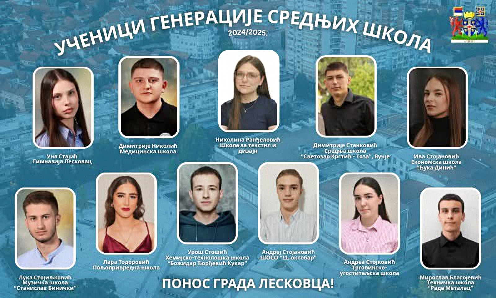 Svetleće bilborde, odnosno reklamne LED ekrane u Leskovcu od pre nekoliko dana krase i fotografije 11 učenika generacije 2024/2025. godine koji su pohađali srednje škole na teritoriji ovog grada. Grad Leskovac se ponosi njima i želi im svu sreću u daljem školovanju.